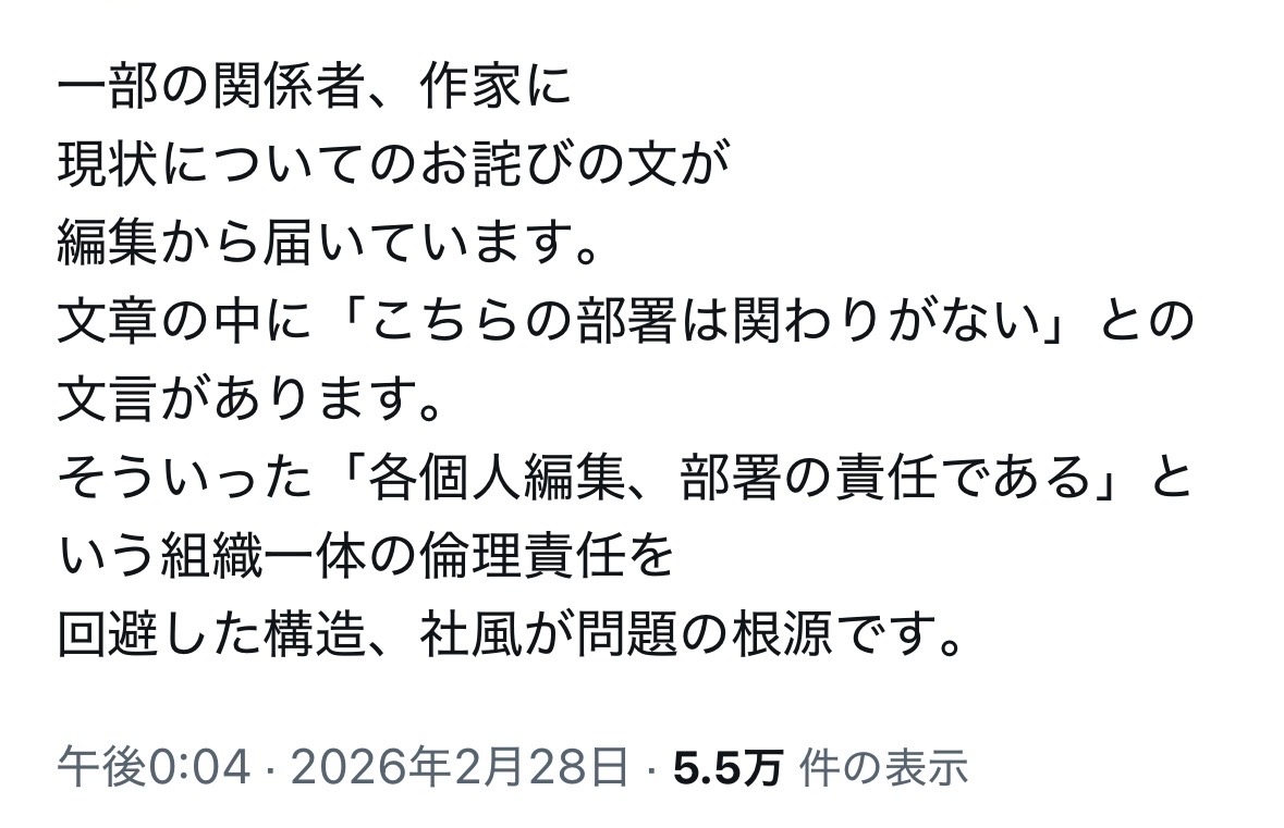 | … | 7526/03/01(日)10:08:37No.1406631456そうだねx2曲がりなりにも出版社に勤めてる人間が舐めた公式声明文出すなよ |