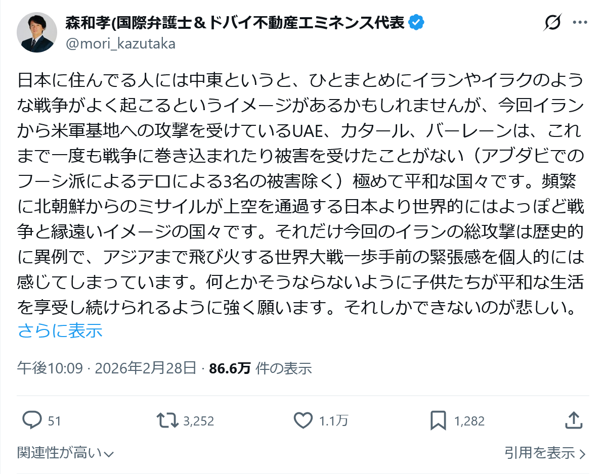 | … | 2726/03/01(日)12:43:44No.1406668417そうだねx18イスラエルとかイランとかの名前は聞いてたのにドバイどこから出てきた? |