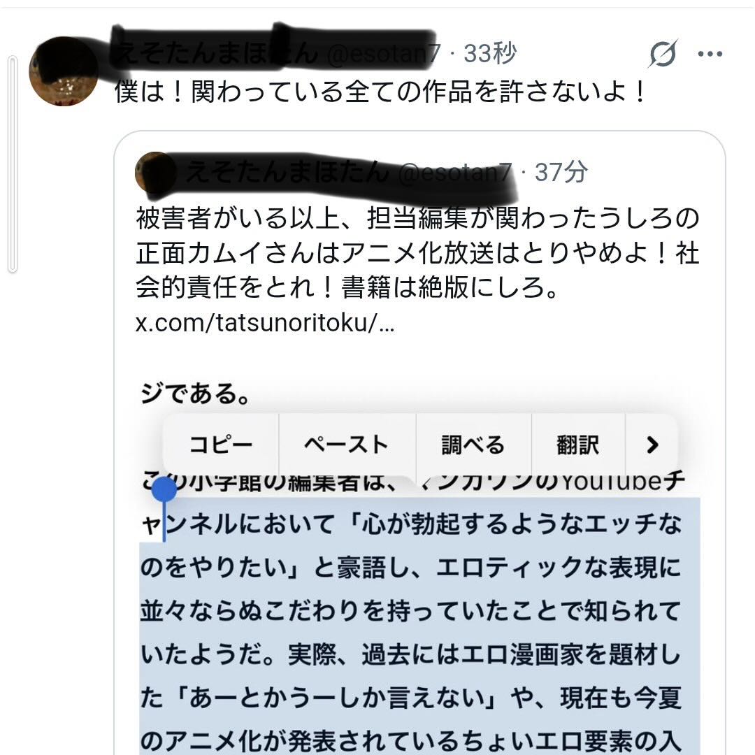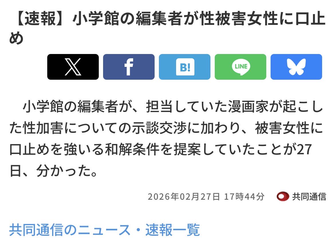 | … | 92526/03/01(日)15:29:39No.1406712844そうだねx1小学館全体が悪い訳じゃないってのはそうかもしれないけど業務上で社員がやらかしたんなら会社が責められるのも仕方ないだろ…って思う |