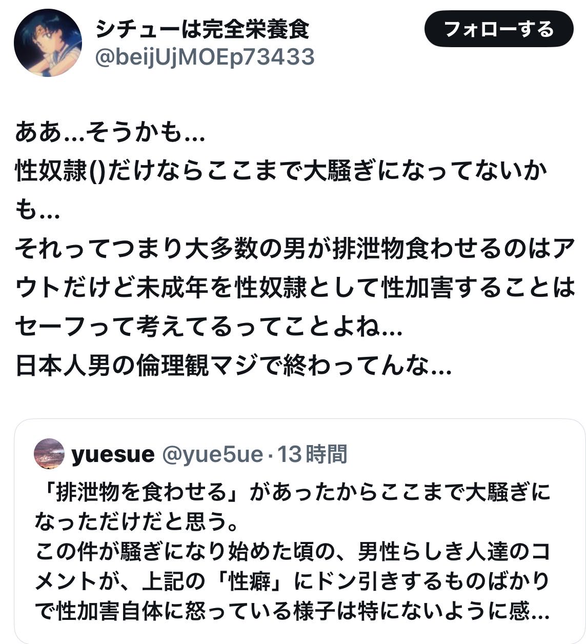 | … | 6026/03/01(日)14:25:34No.1406695049+最初よく知らんかったからフィクションを本当にやっちゃだめでしょみたいなポスト多くてスカ系エロ漫画家がやらかしたのかと思ってた |