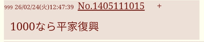 | … | 7026/03/01(日)14:00:33No.1406688543+>事件発生前日の不老不死おかわりトークを見てると里ちゃんが平家をこのカスがあ〜!って思いながら死ぬ |