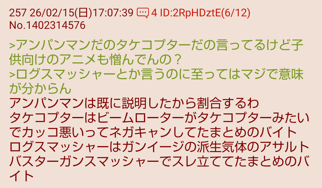 | … | 426/03/01(日)18:30:39No.1406766100+そもそもわりあいって読んでたんだろうな… |