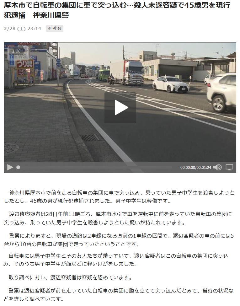 | … | 24126/03/02(月)10:18:51No.1406957483そうだねx2どう転んでも故意に轢くのは擁護しようがないが中学生たちが記事になってない部分で何をやったのかは気になるな |