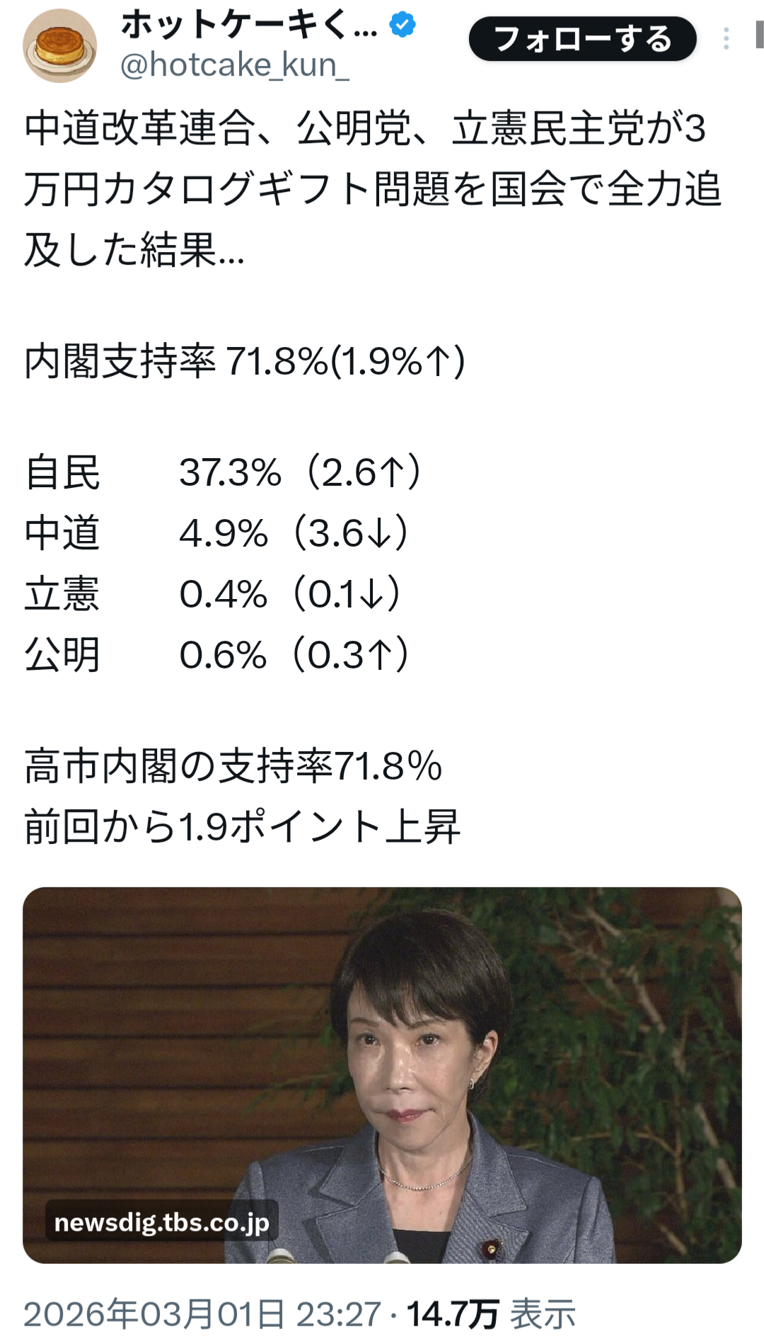 | … | 3026/03/02(月)07:55:01No.1406938223+石破の時は右も左も協力して叩いて謝罪させたのに… |