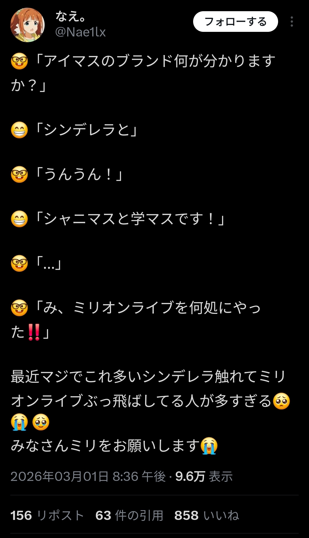 | … | 1026/03/02(月)08:11:29 ID:tMFyzlAoNo.1406940259そうだねx4>>当のミリPがこう声をあげてるのが泣ける |