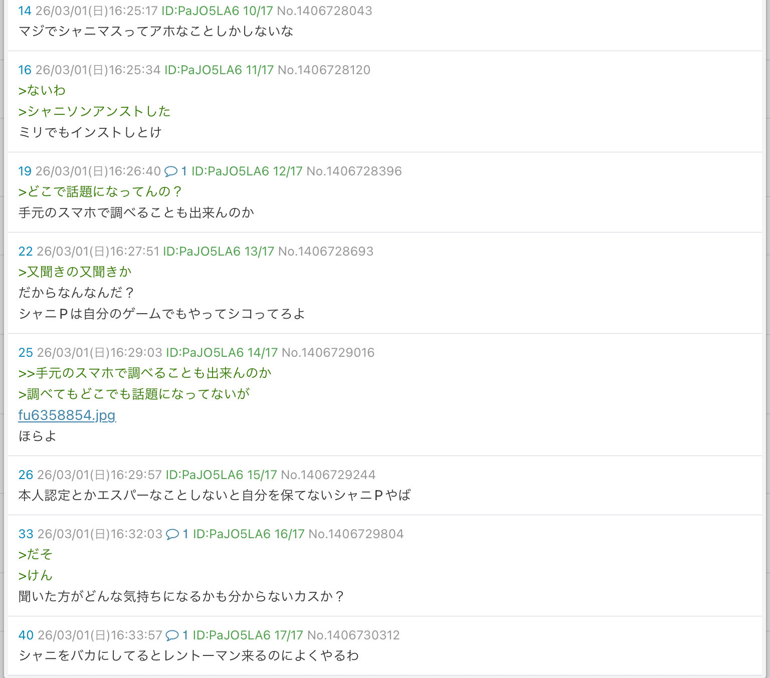 | … | 7626/03/02(月)09:56:57No.1406954085+>そもそもこいつ全部に粘着してて荒らした後に自演で荒らしてるの◯◯Pだろって対立煽りで言い出す |