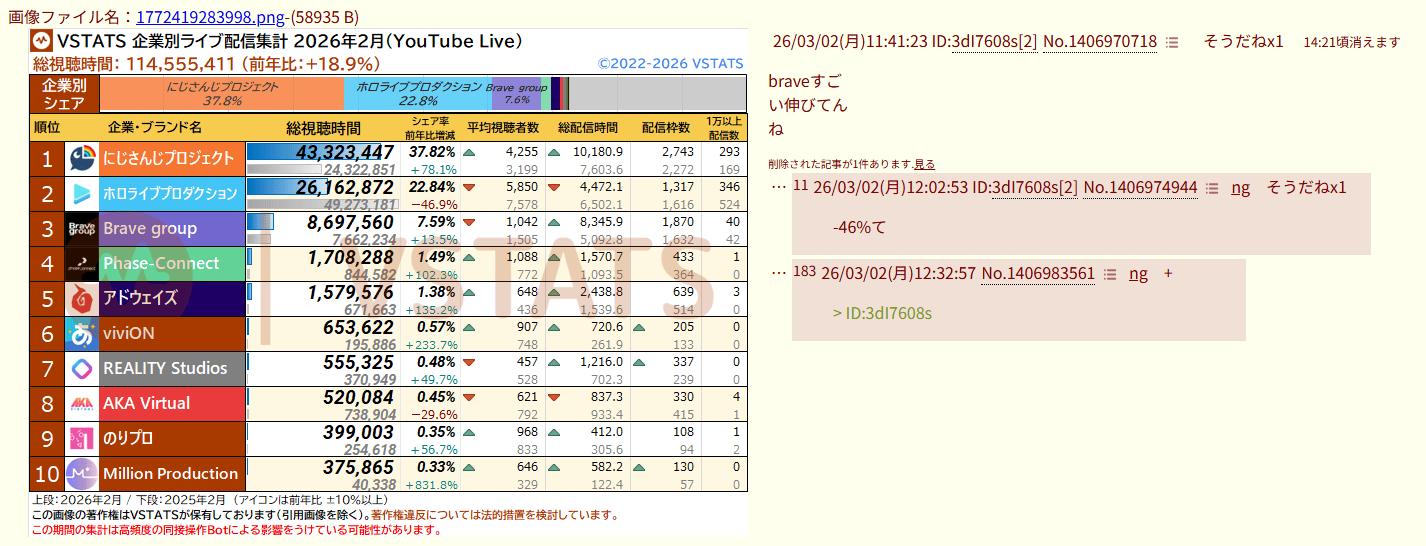 | … | 9426/03/02(月)12:23:31No.1406980634そうだねx7>にじさんじが衰退してるデータでスレ立てろ |