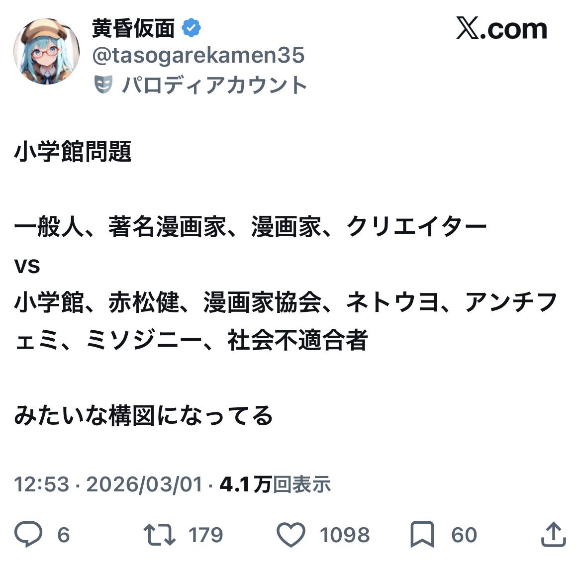 赤松が小学館側ってのが前提だから何言っても小学館側って認識なんだと思うああいう人は