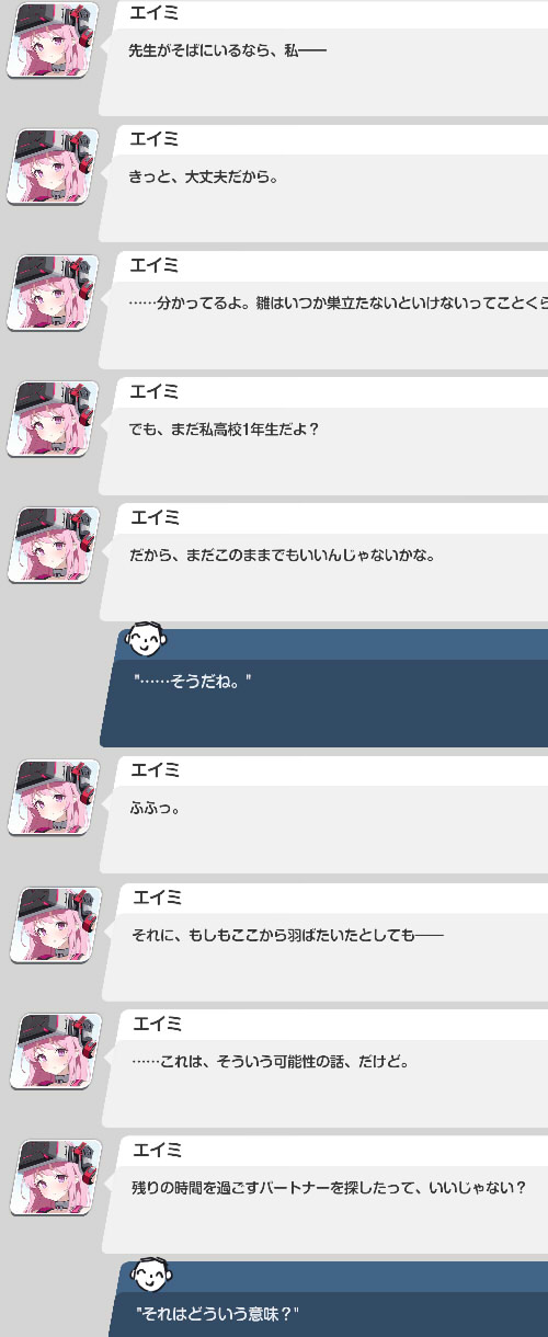 | … | 44226/03/02(月)17:19:04No.1407047962+セイアがスミレに捕まった時のゲームオーバースチル欲しかったなぁ |