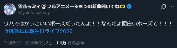 | … | 2526/03/02(月)20:09:31No.1407103985+ねねちやっぱり生ライブか |