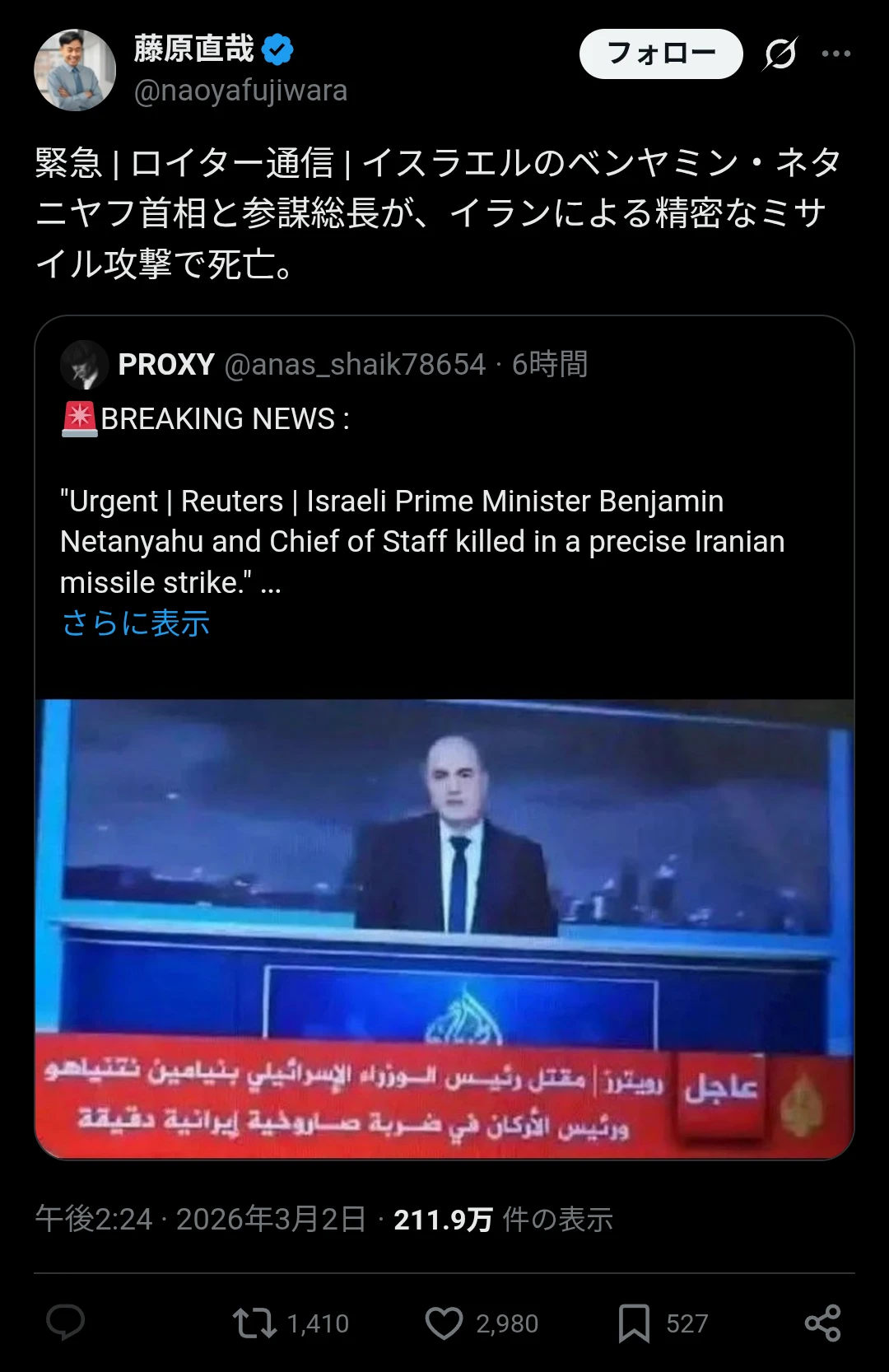 | … | 3026/03/02(月)21:13:54No.1407137992そうだねx16ネタニヤフはデマだろ… |