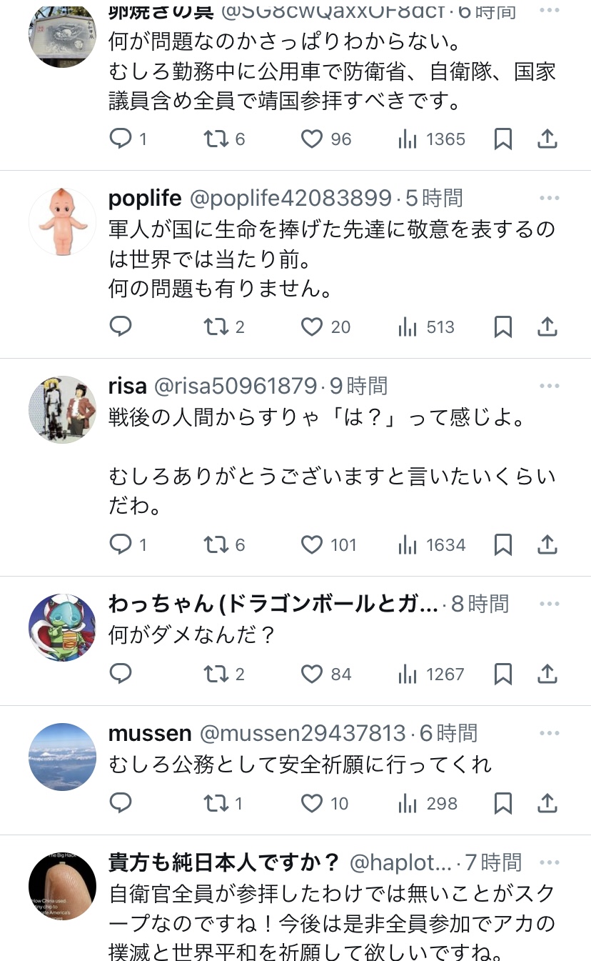 | … | 63926/03/04(水)11:08:35No.1407563470+>【悲報】海上自衛隊幹部165人が靖国参拝→普通の日本人「何が問題なんだ?」 |