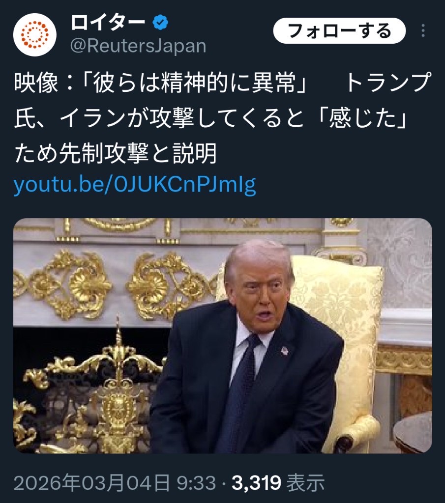 | … | 2026/03/04(水)10:43:01No.1407559480+アメリカ大統領に理性がないのを公式に認めるんだ… |
