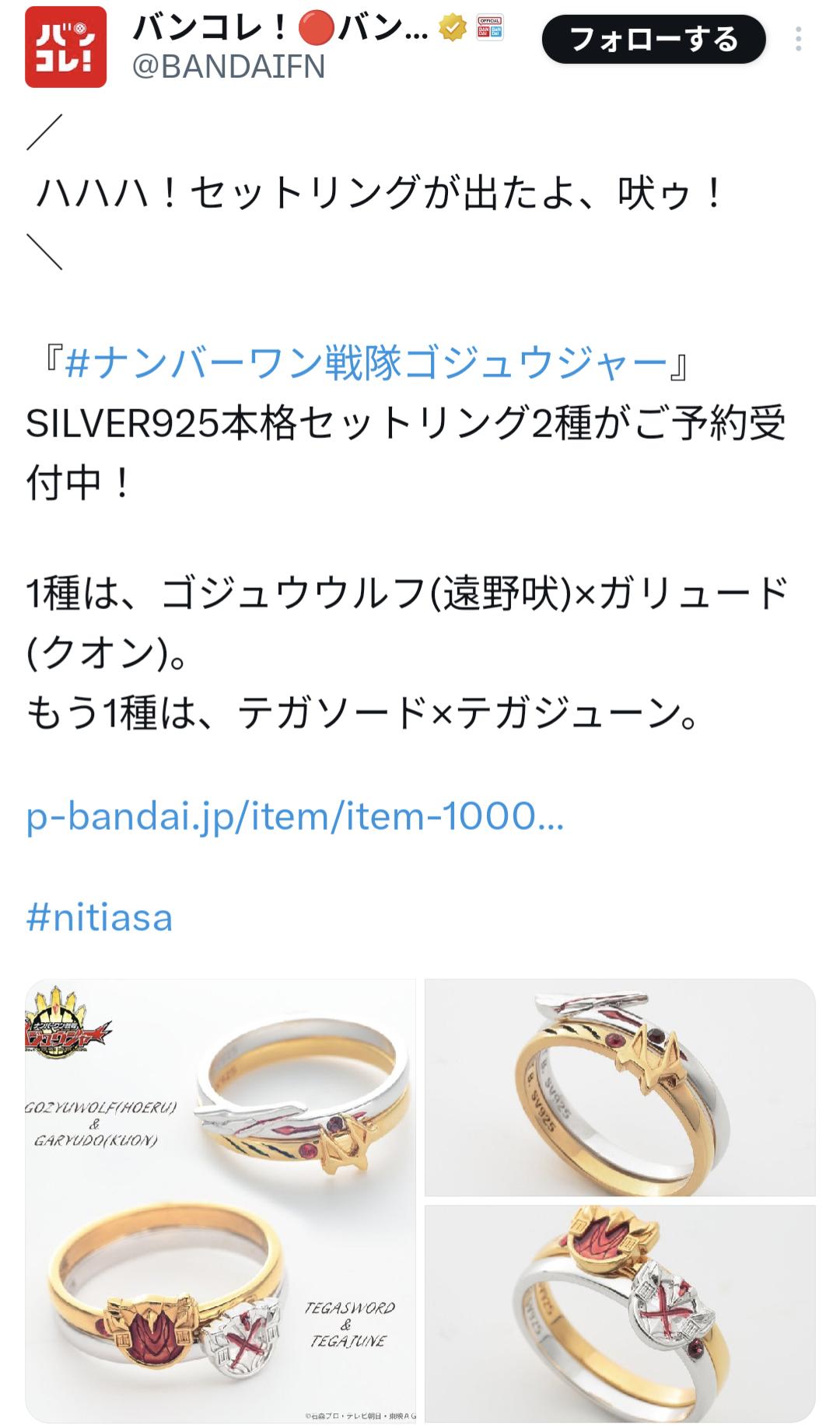 | … | 426/03/04(水)12:12:31No.1407575807そうだねx2ゴジュウは変身がエンゲージだし指輪がキーアイテムだし作中でも結婚式あるからセットリングも納得のキャラグッズなんだけどさあ… |