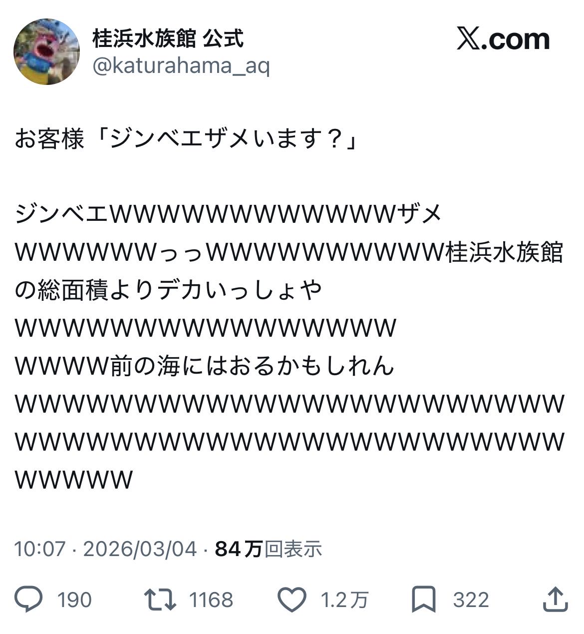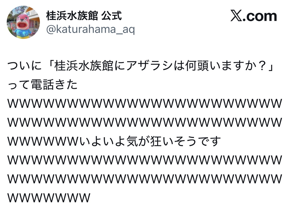 | … | 8026/03/04(水)12:46:11No.1407586441+知らん水族館だから単に客を馬鹿にしてるのかと思ったわ |