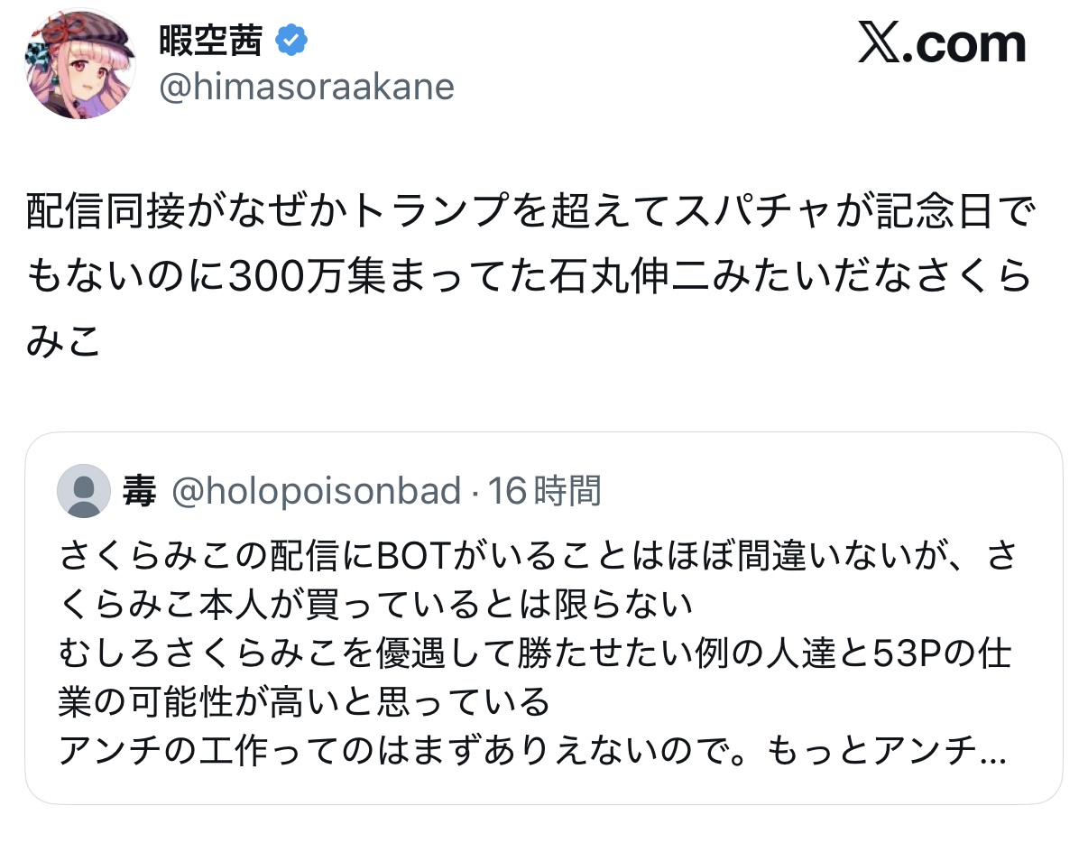 | … | 72326/03/04(水)19:31:56No.1407680710+>>主張がよくわからないんだけど同接もスパチャも多いならただただ見てる人が多いのでは…? |