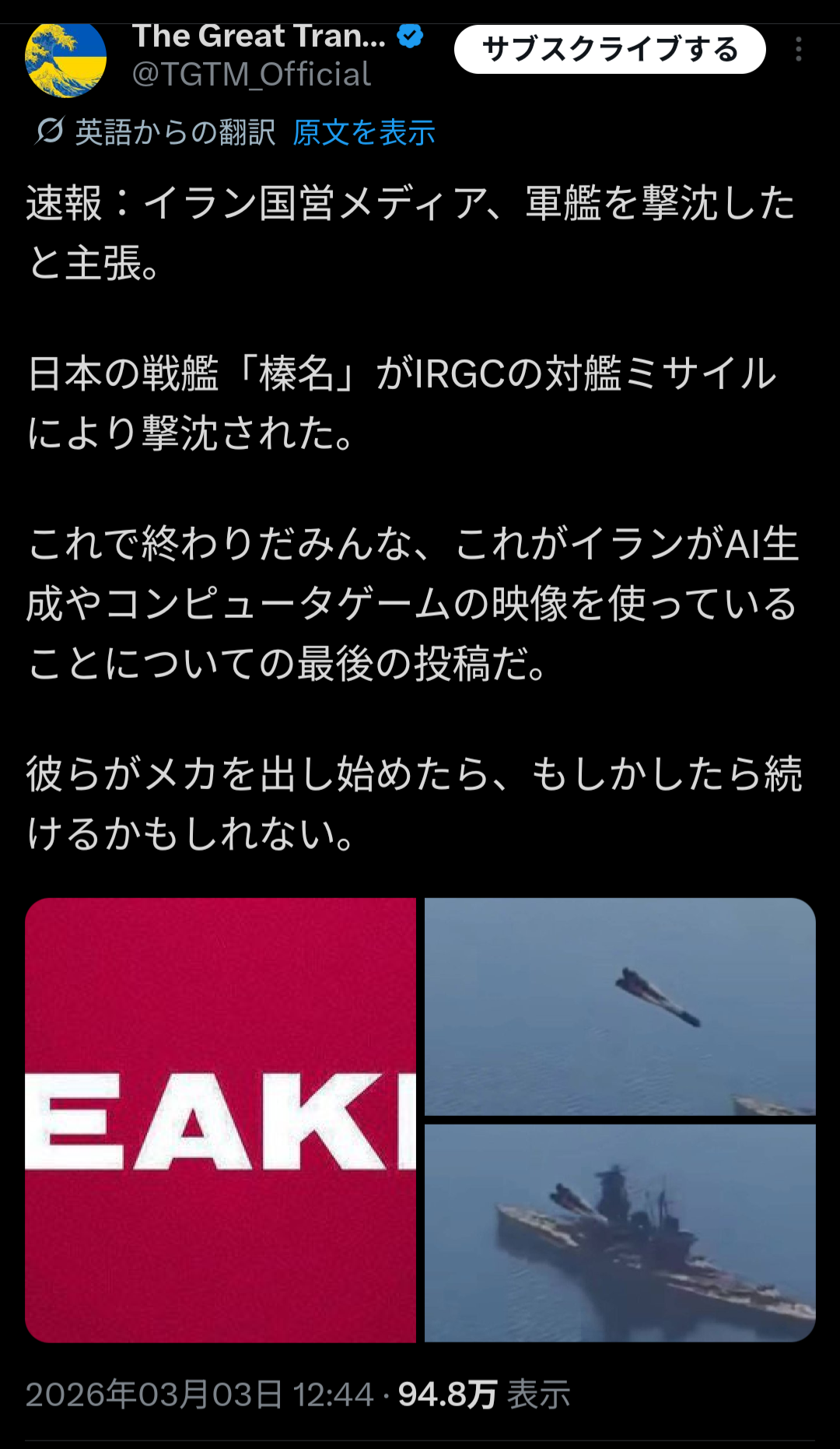 | … | 3426/03/04(水)18:07:46No.1407654628+イラン国営メディアが発信したという情報がまったく確認取れてない |