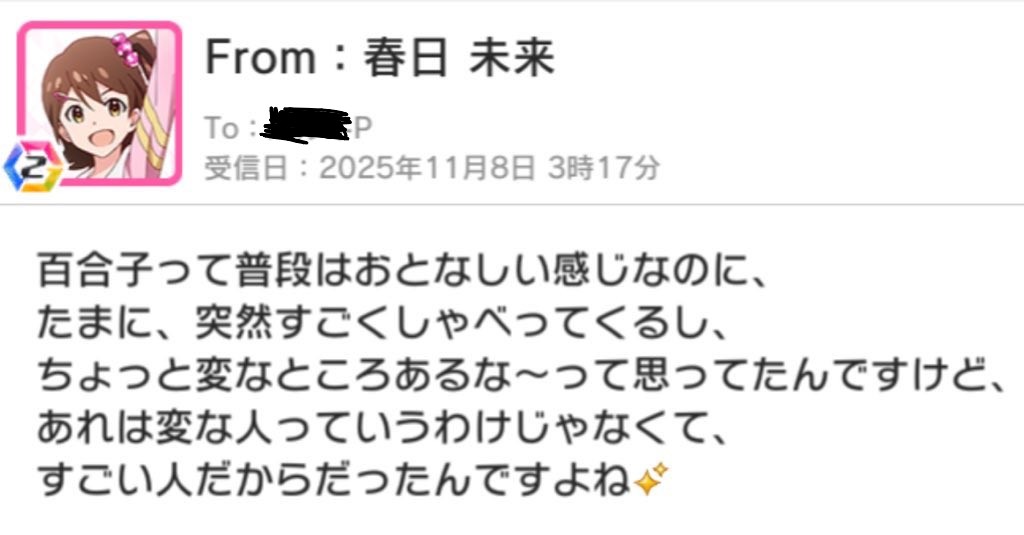 | … | 3526/03/04(水)19:02:00No.1407670897+なんやかんやで百合子に懐いてるよね未来 |