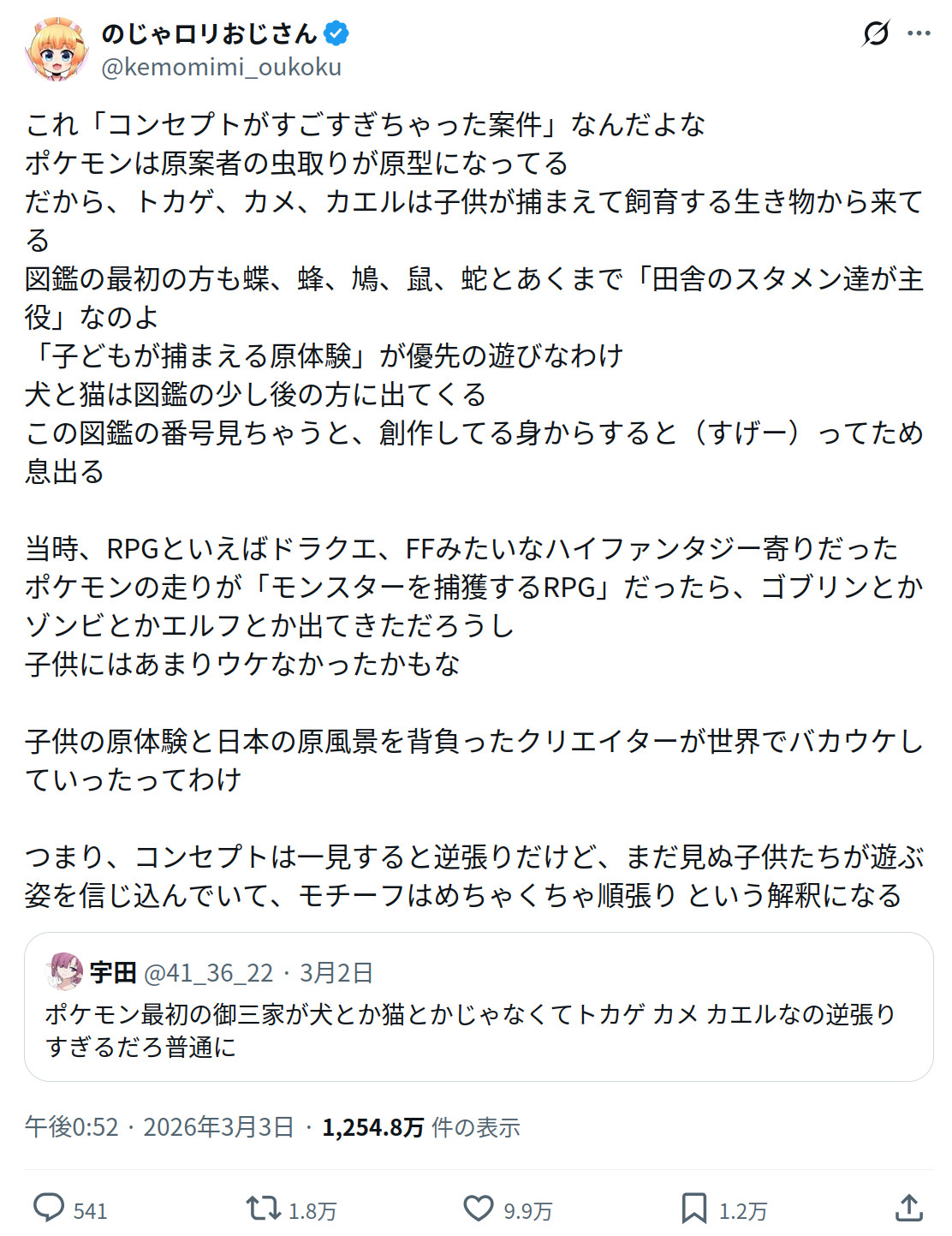 | … | 1826/03/04(水)20:16:08No.1407695754そうだねx3少なくともポケモンのモチーフが虫取りなのは昔からずっと一貫してインタビューでも言われてる |