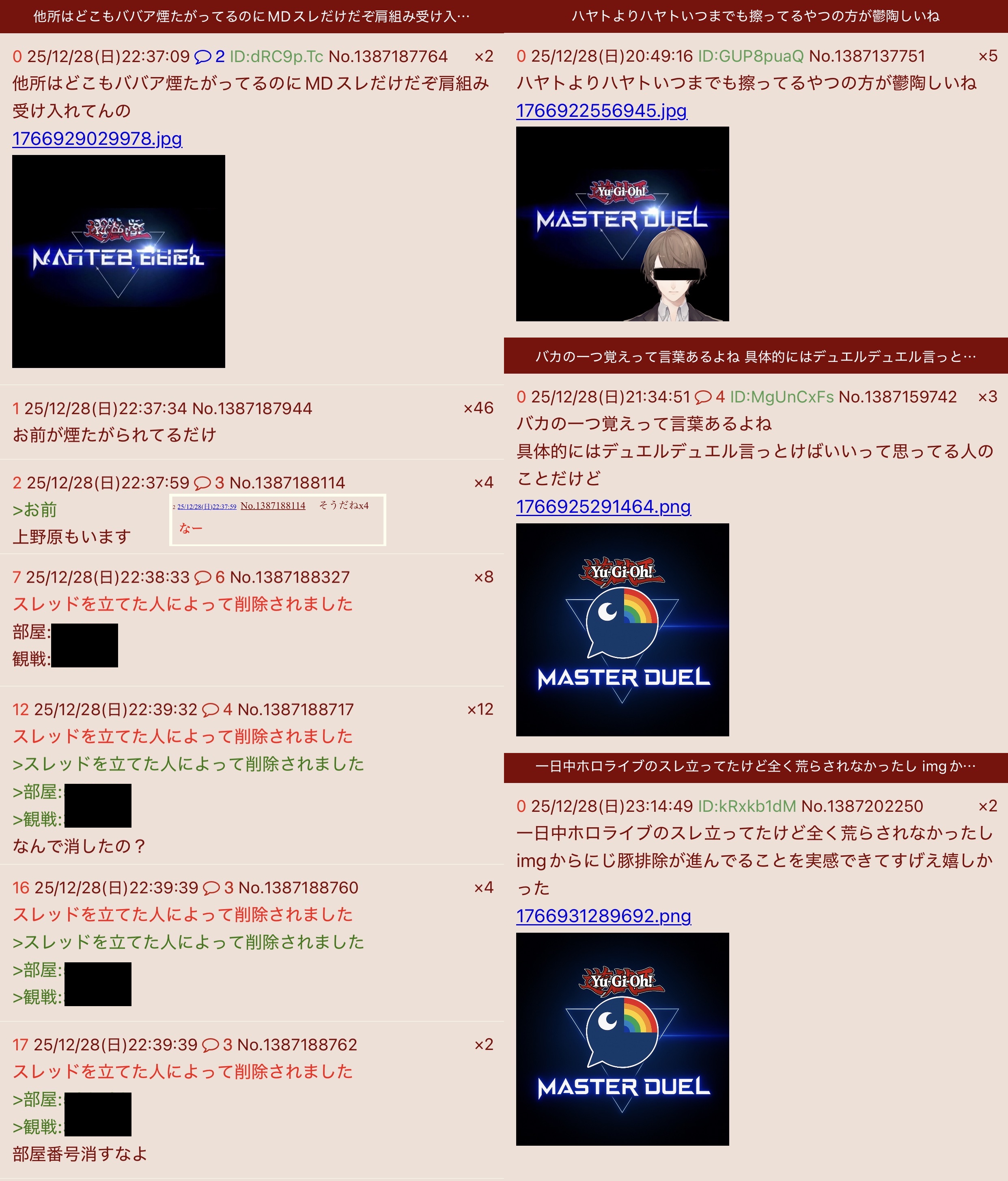 | … | 8426/03/04(水)21:00:12No.1407711869+>毎日立ってるコロシアムの発端は荒らしにデュエルふっかけたことだが… >荒らしは何故かデュエル出来ないから部屋立てて乗っ取るのが常套手段だけどMDエアプか? 冷静に考えるとこの経緯の方がだいぶおかしいのにすっかり定着してるのどうしても笑っちゃう |