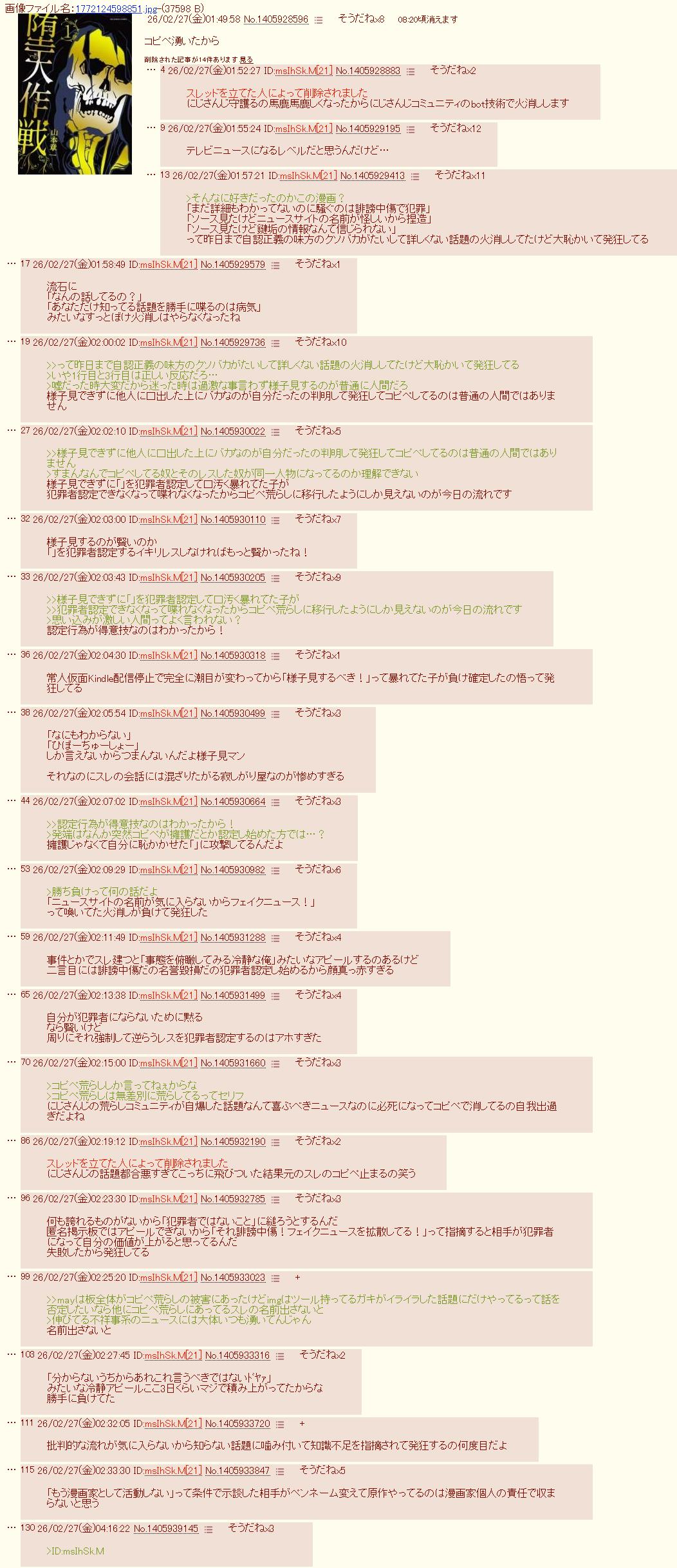 | … | 2026/03/04(水)20:48:41No.1407707578そうだねx9スレッドを立てた人によって削除されました しょうもないレス削除は白旗と同義なんだよね 部屋:581133 観戦:688039 |