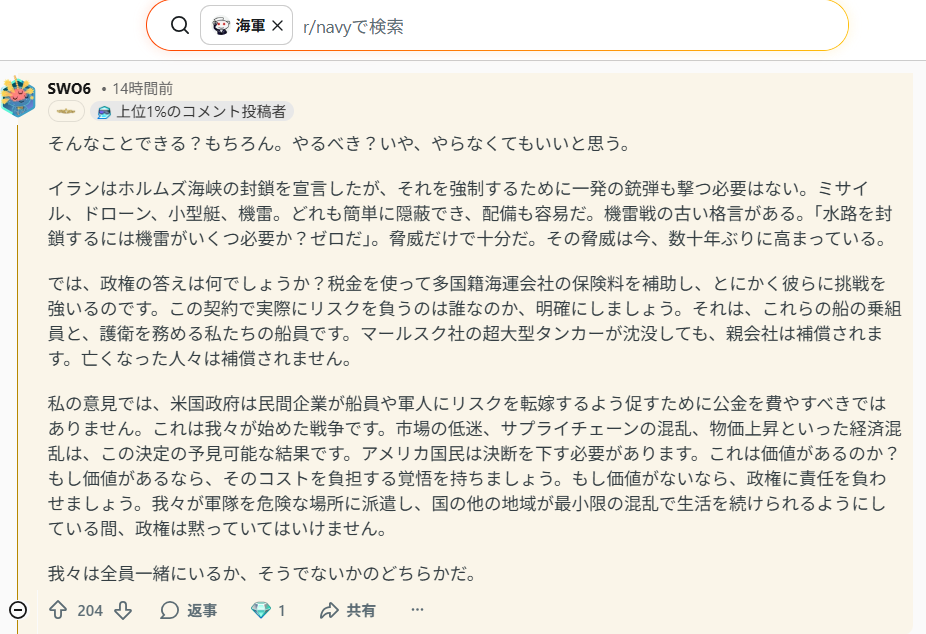 | … | 5026/03/04(水)20:52:10No.1407708873そうだねx1>ミサイルの価格だけでどれだけ金かかるか分かったもんじゃないし護衛があったところで安全ではないし頼みたい民間船なんて無いだろ |