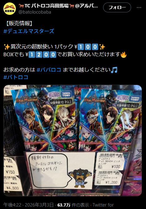 | … | 2126/03/04(水)21:58:52No.1407733128そうだねx11発売当初はデュエマスレでにじさんじのシングル価格がーってウキウキだったのにどうして… |