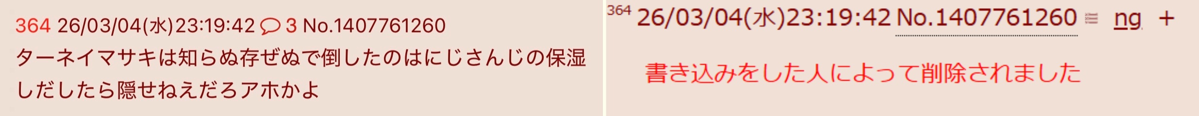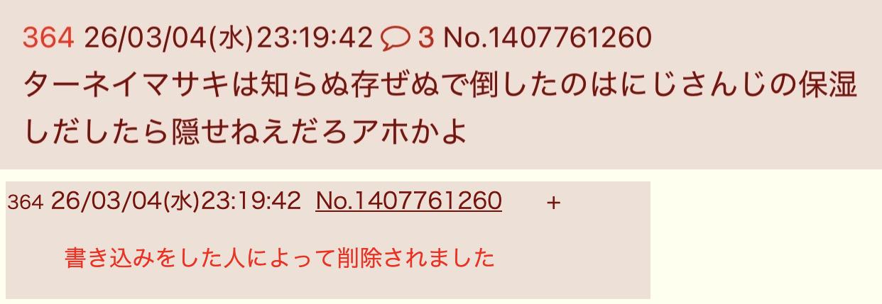 | … | 326/03/04(水)22:24:50No.1407742581そうだねx10スレッドを立てた人によって削除されました |