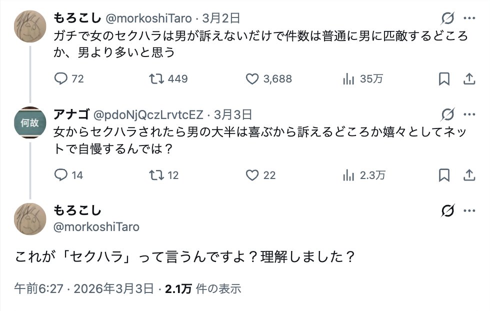 | … | 2226/03/04(水)22:32:38No.1407745427+女→男のセクハラに関しては男がセクハラと思っても我慢してるケースもあるだろうけど |