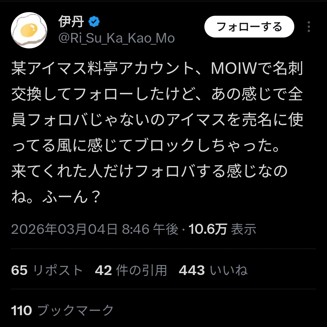 | … | 8926/03/05(木)10:51:38No.1407845920そうだねx5>アイマスを店の売名に使うな!だけで良かったのにフォロバどうこう混ぜたせいで俺をフォローしなかった!って私怨みたいになっちゃったの悪手 |