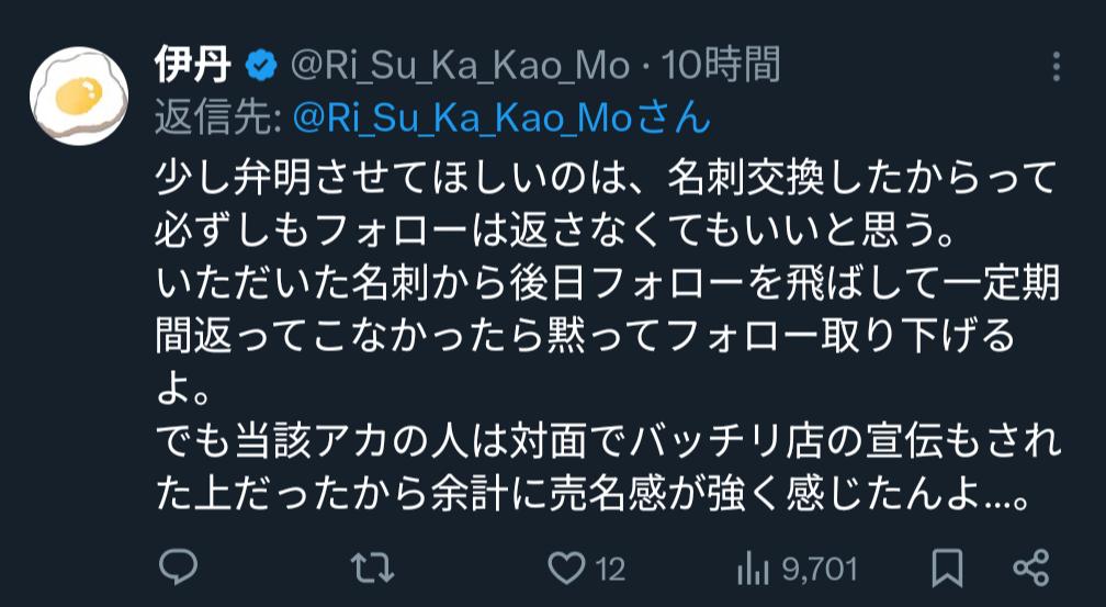 | … | 5326/03/05(木)09:59:45No.1407837172+>少し弁明させてほしいのは、名刺交換したからって必ずしもフォローは返さなくてもいいと思う。 |