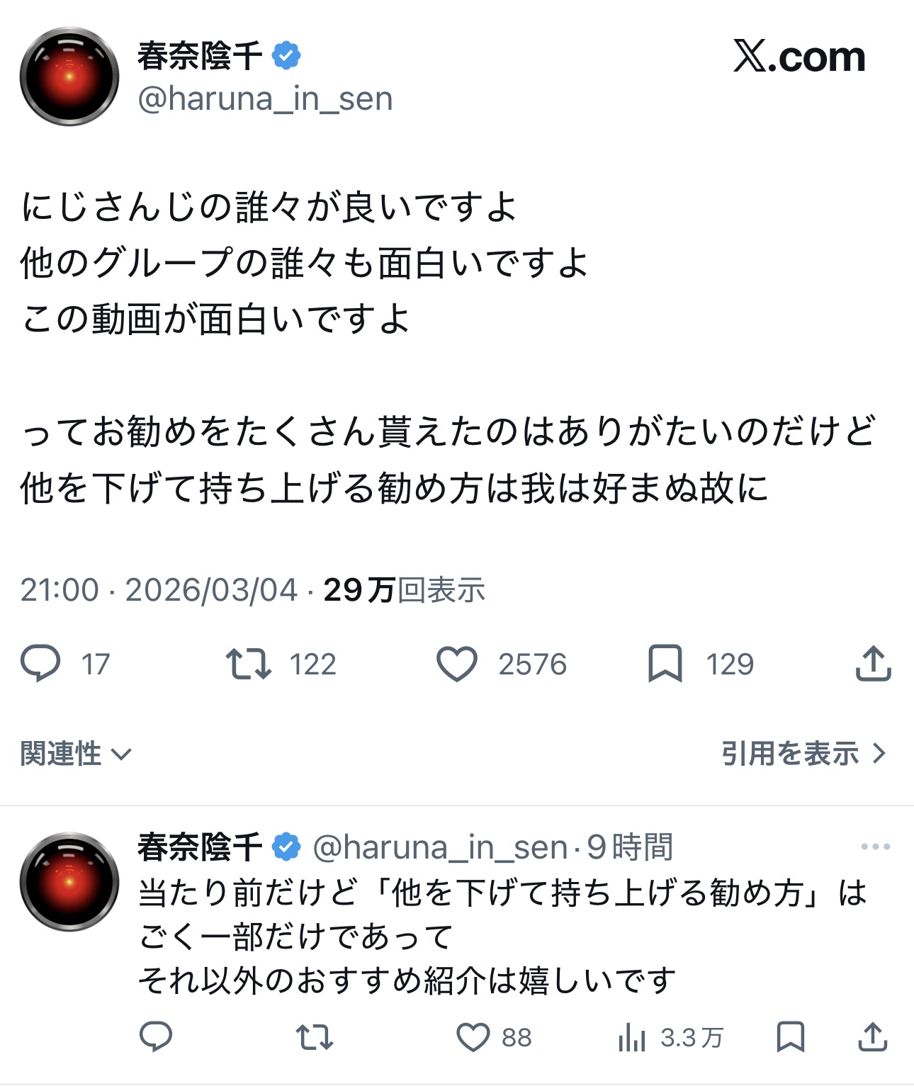 | … | 1026/03/05(木)22:14:00No.1408021745そうだねx19めっちゃ言葉選んでくれてるけどまずホロライブとガンダムのコラボの話してる時ににじさんじオススメしてくることが異常だからな |