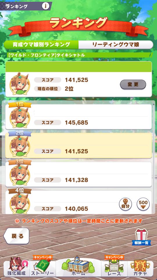 | … | 33026/03/06(金)12:10:02 ID:EW1zUbnENo.1408137698+なんかお知らせだとランキング報酬受け取り出来る期間の様な書き方してますけどヘルプだと終了後二時間は集計中って書いてますね… |
