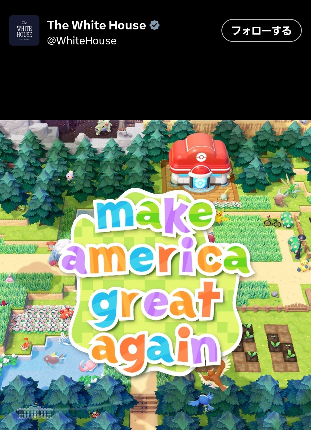 | … | 8926/03/06(金)09:28:35No.1408110142+真ん中のロゴ部分だけコラして出すならまだわかるけど堂々と周りのポケモン部分で出してくるのマジでホワイトハウスの投稿じゃなさすぎる |