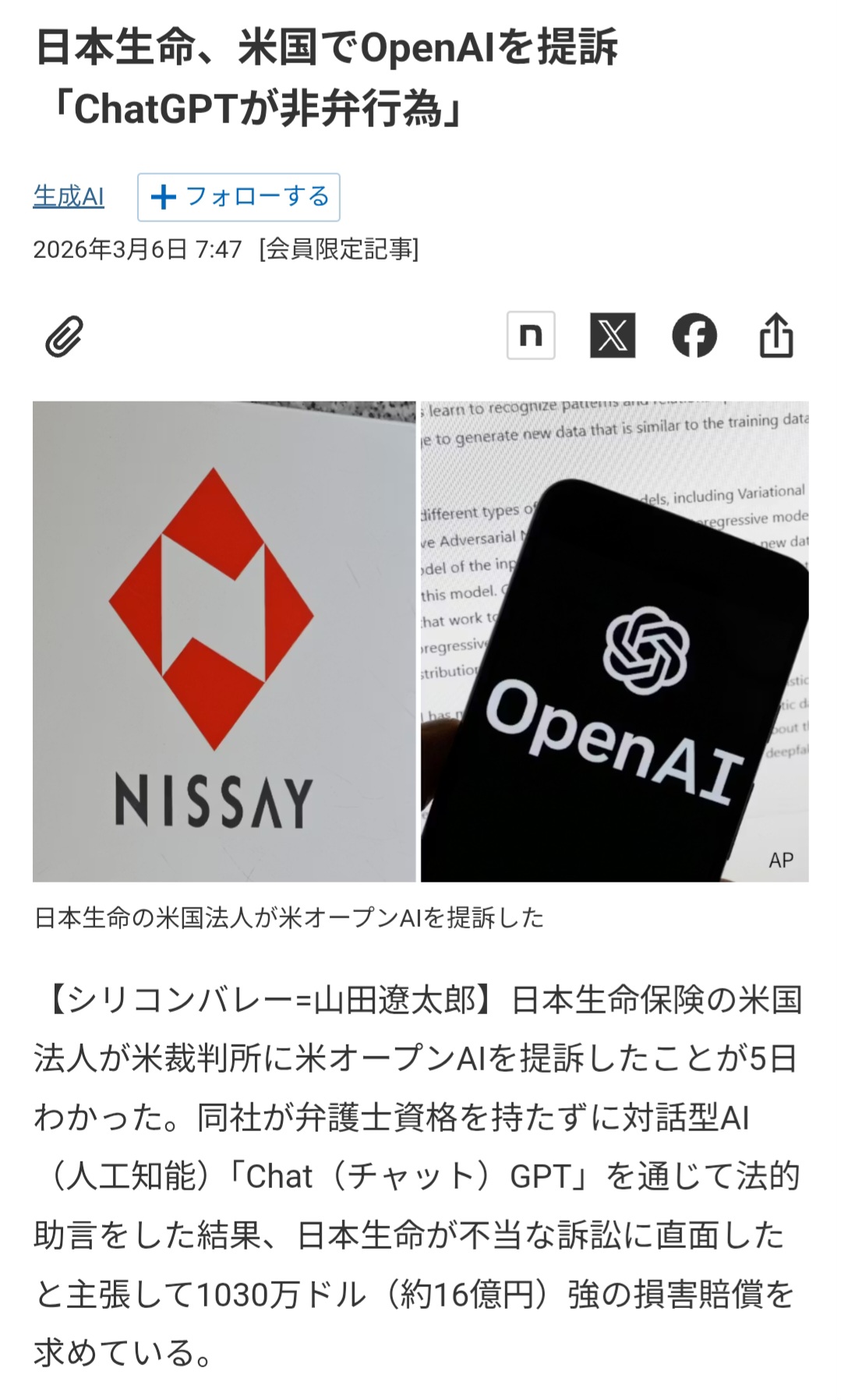 | … | 1626/03/06(金)14:02:09No.1408164363そうだねx46>日本生命は、和解したはずの元受給者がチャットGPTを頼りに訴訟を再燃させたことで、多額の費用が発生し損失を被ったと主張している。弁護士費用などの補償として30万ドル、同様の行為を抑止するための懲罰的賠償で1000万ドルの損害賠償を科すよう求めた。 |