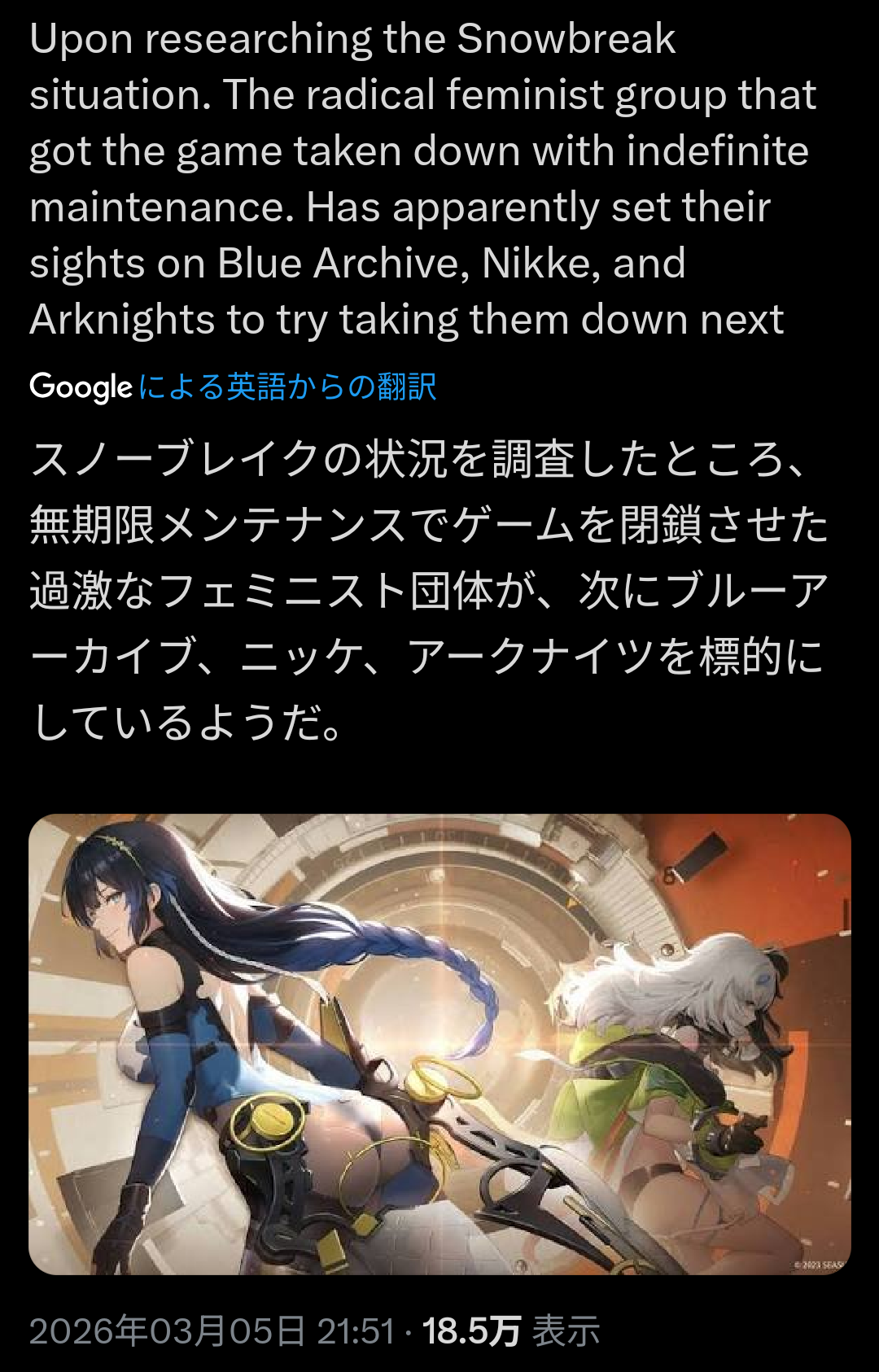| … | 126/03/06(金)15:47:04No.1408185123そうだねx39アークナイツはともかくブルアカとNIKKEは韓国企業なんだから無理だろ |