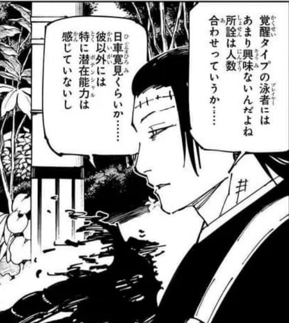 | … | 30626/03/06(金)19:29:52No.1408239265+>日車が五条に匹敵する潜在能力で髙羽は術式なら五条に対抗し得るだっけ |