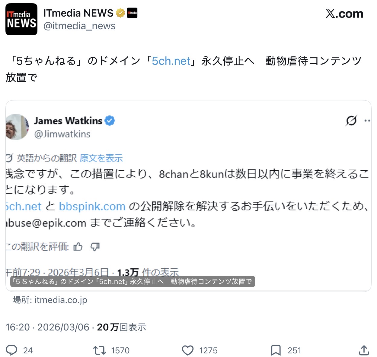 | … | 2326/03/06(金)18:43:21No.1408222220+動物虐待コンテンツの放置でドメインごと死ぬんだ… |