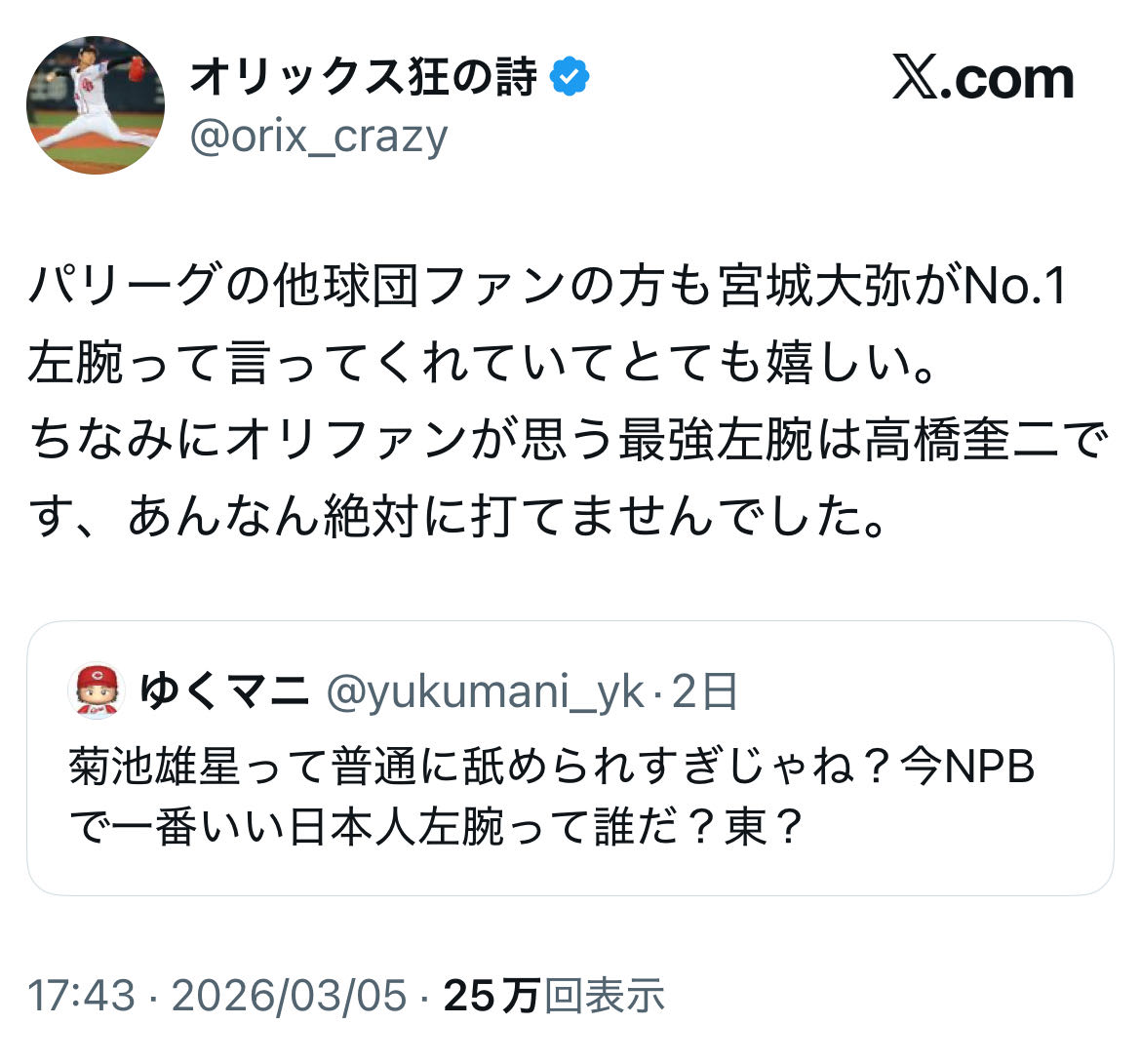 | … | 4026/03/06(金)20:06:01 ID:nisLajwsNo.1408253748+五回コールドになんてなったら興行的にアカンすよ |