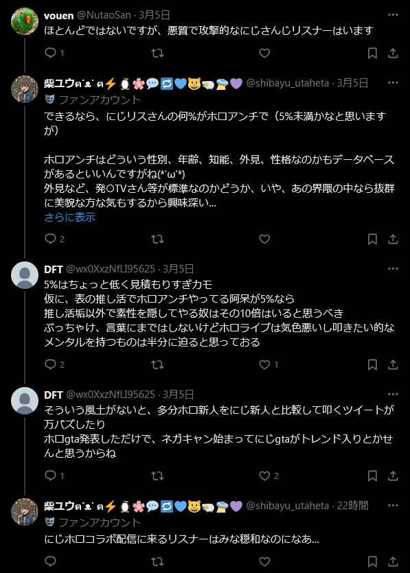 | … | 826/03/06(金)21:53:43No.1408296747そうだねx22>そんなにホロライブをにじリスは荒らしてるのか |