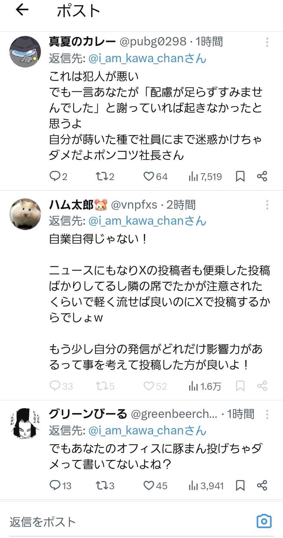 | … | 13026/03/06(金)23:15:08No.1408326789+この人に落ち度が皆無とは言わないけどオフィスに豚まん投げつけて逃げるのは人ではなく怪物だ |