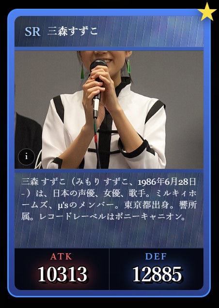 | … | 19126/03/06(金)23:51:26No.1408338897+大御所声優がステータスは高いのにレアリティ低いのは画像が殆どないからか |