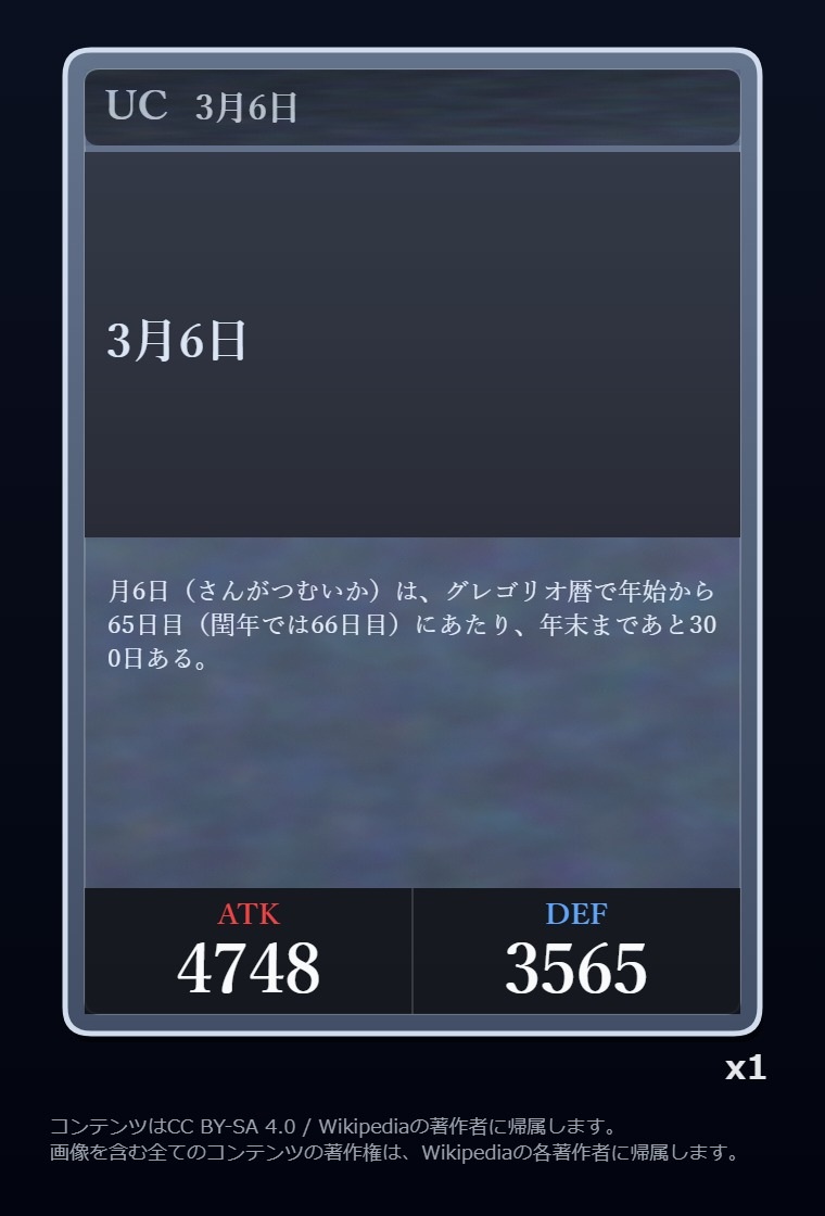 | … | 4226/03/06(金)23:00:33No.1408321752+Wikipediaガチャ結果: |