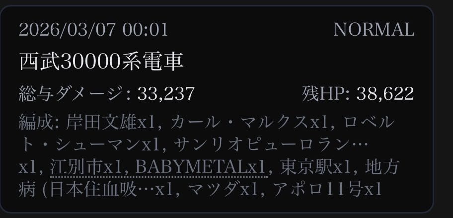 | … | 27226/03/07(土)00:07:58No.1408344055+電車の討伐報告が次々と…! |
