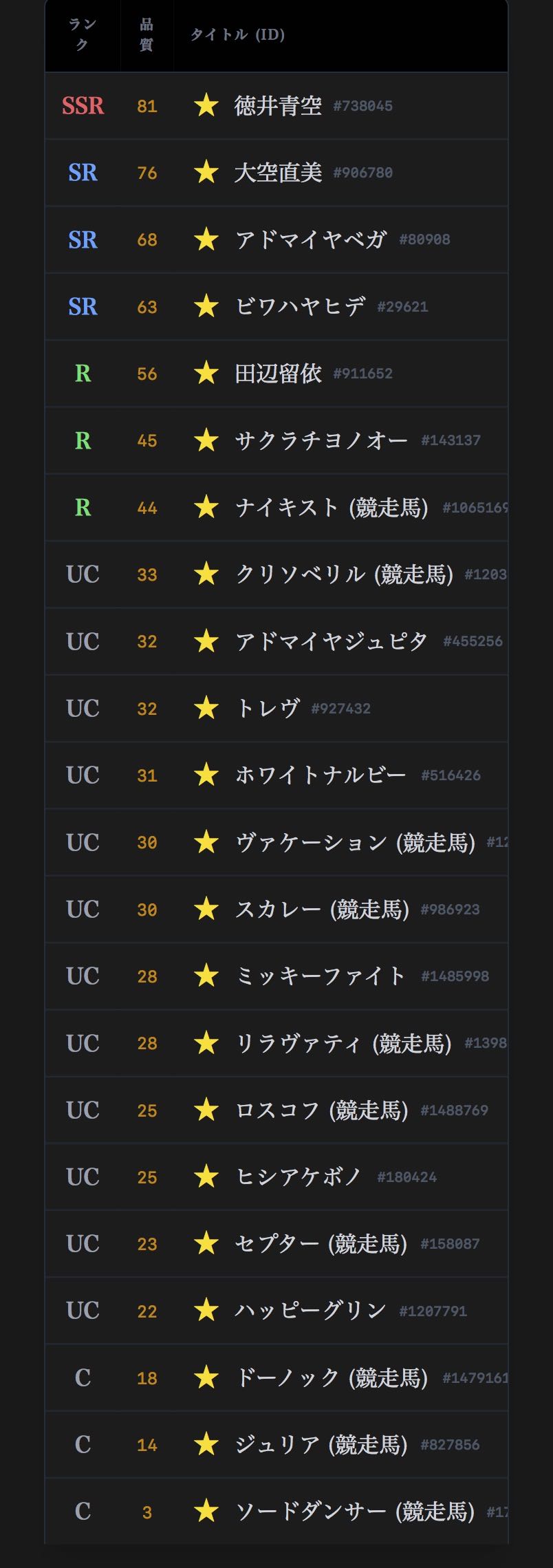 | … | 22926/03/06(金)23:58:00No.1408341010+ちなみにトーセンジョーダンは品質27.73なんでまあ…UCだね… |