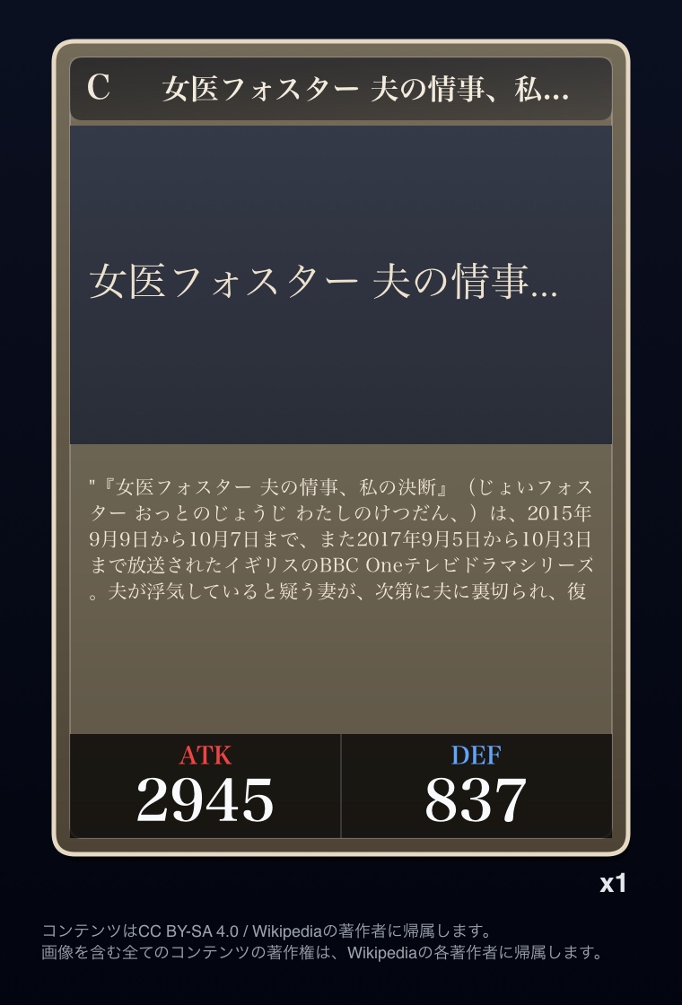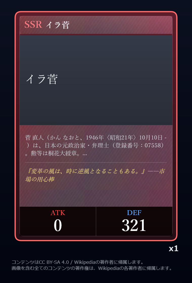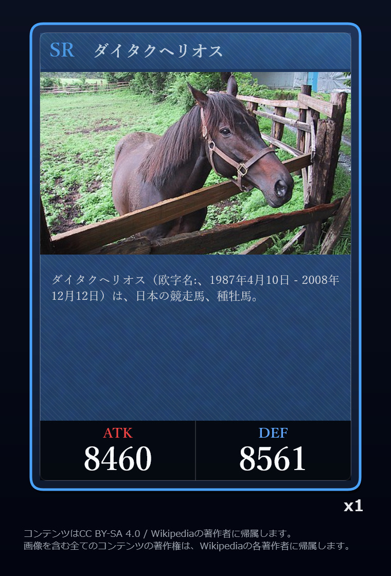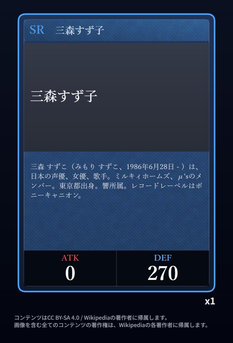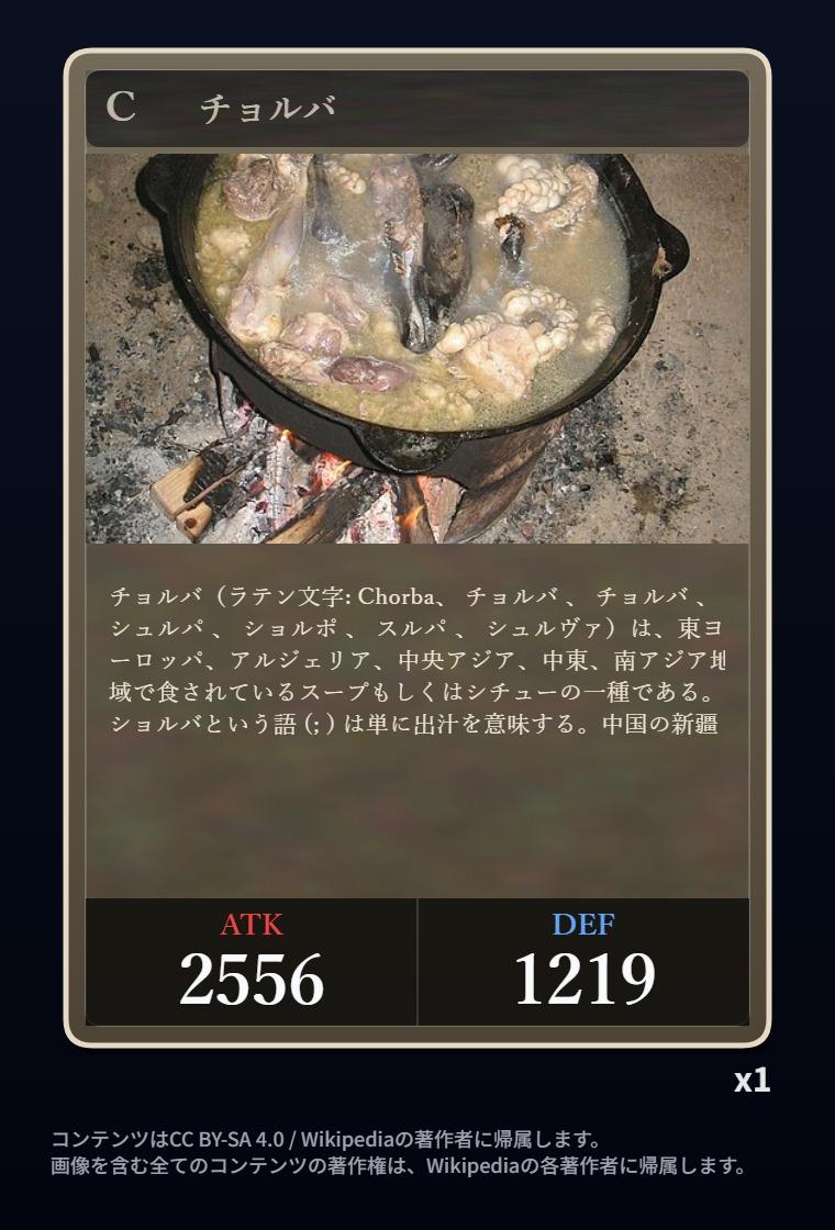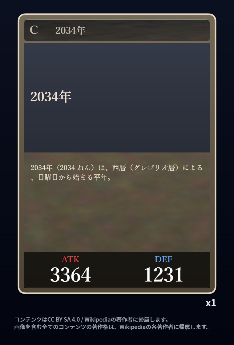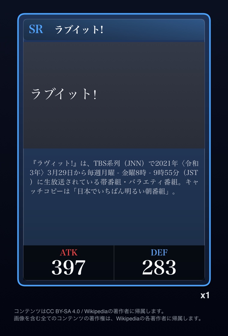 | … | 2326/03/07(土)00:32:00No.1408351352+記事が気になってWikipediaを開いてしまうカードは良いカード |