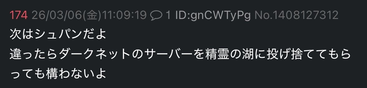 | … | 28926/03/07(土)11:01:22 ID:fjpZPvg.No.1408416764+「」ミーは三か月前にシュパンがくるって言ってたもん! ホントだもん! |