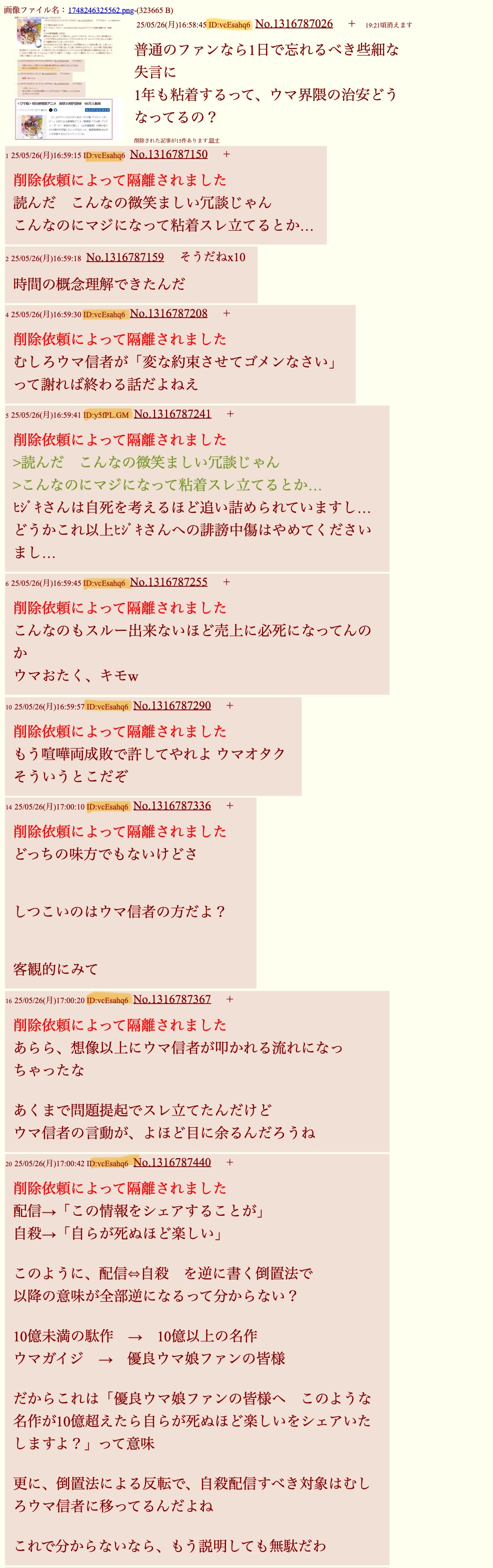 | … | 5126/03/07(土)16:42:57No.1408497867+>当然同じソシャゲ粘着スレ豚 |