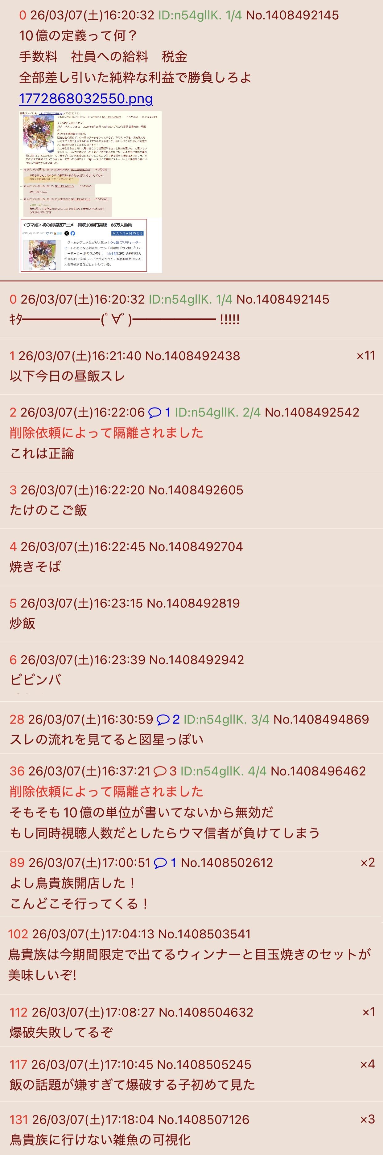 | … | 226/03/07(土)16:22:06 ID:n54gllK.No.1408492542+削除依頼によって隔離されました |
