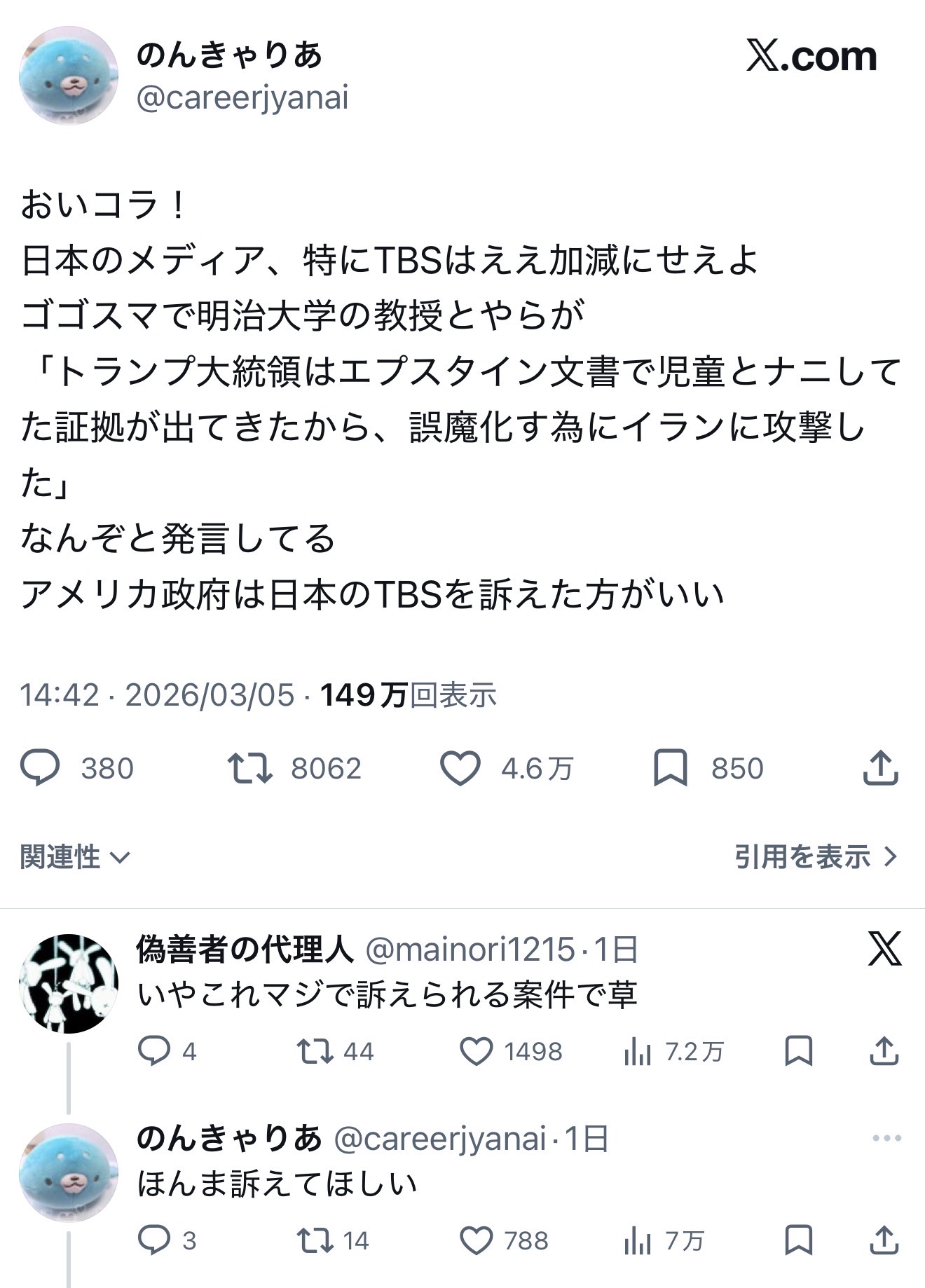 | … | 626/03/07(土)17:20:04No.1408507600+TBSとアメリカの最高裁を訴えます |
